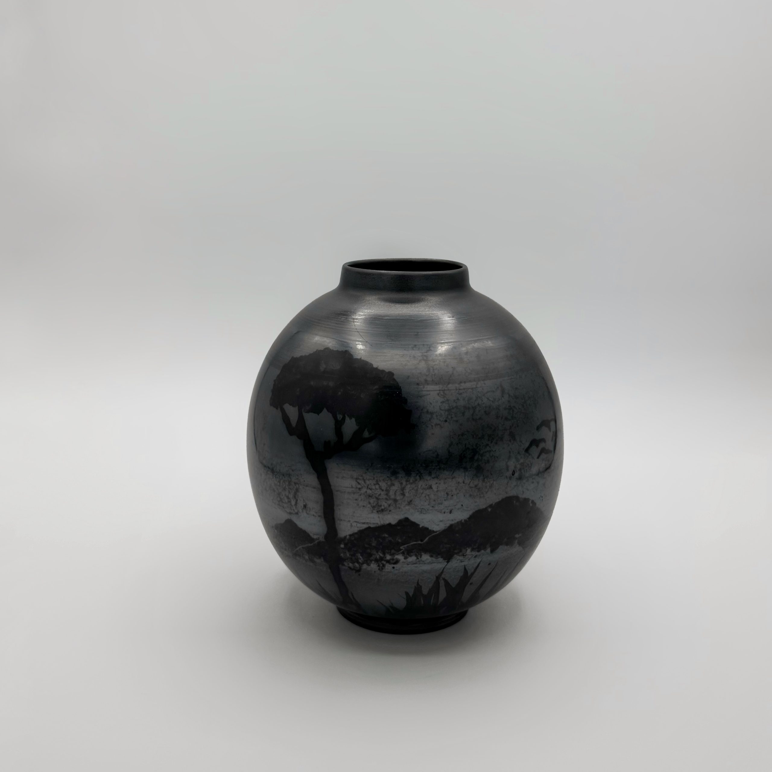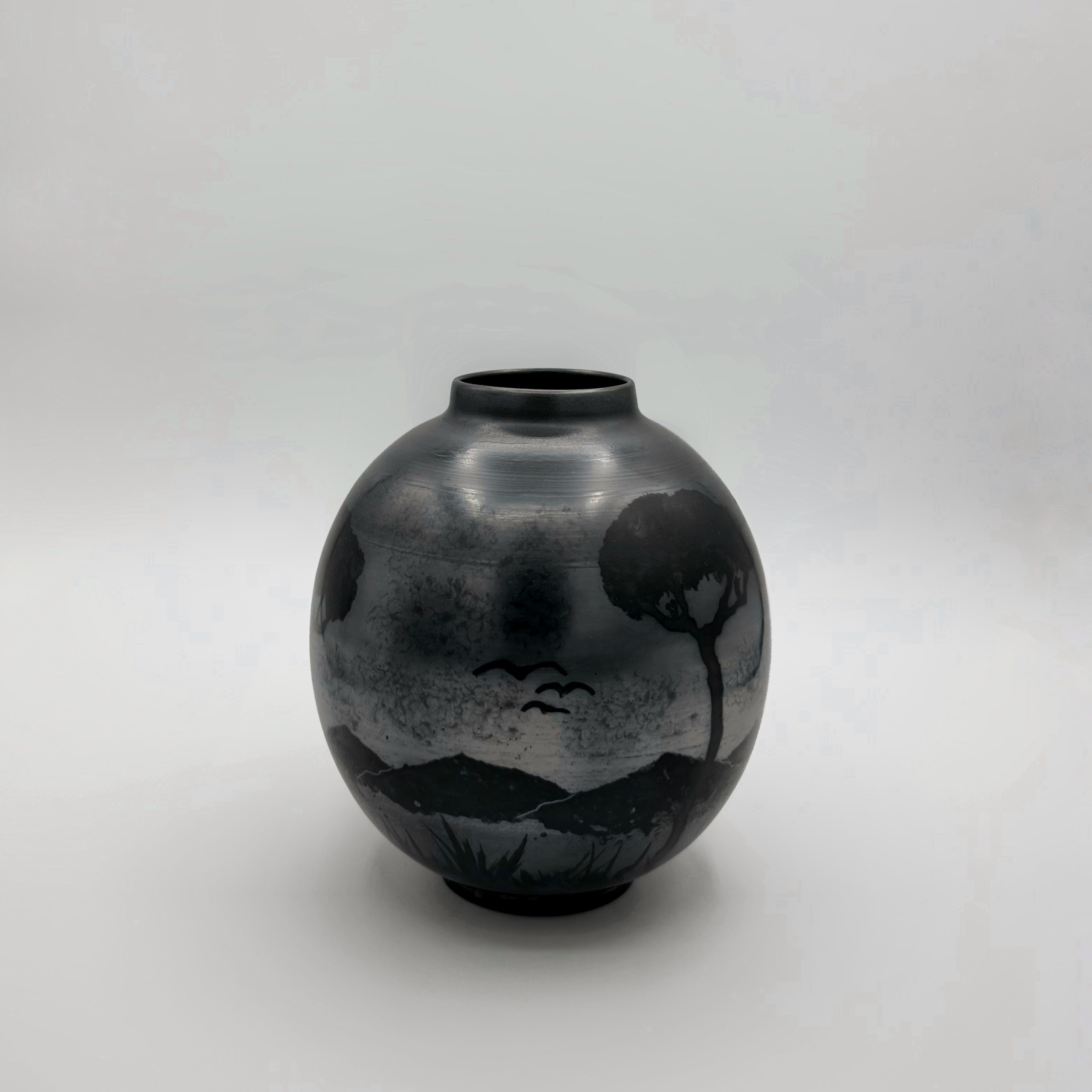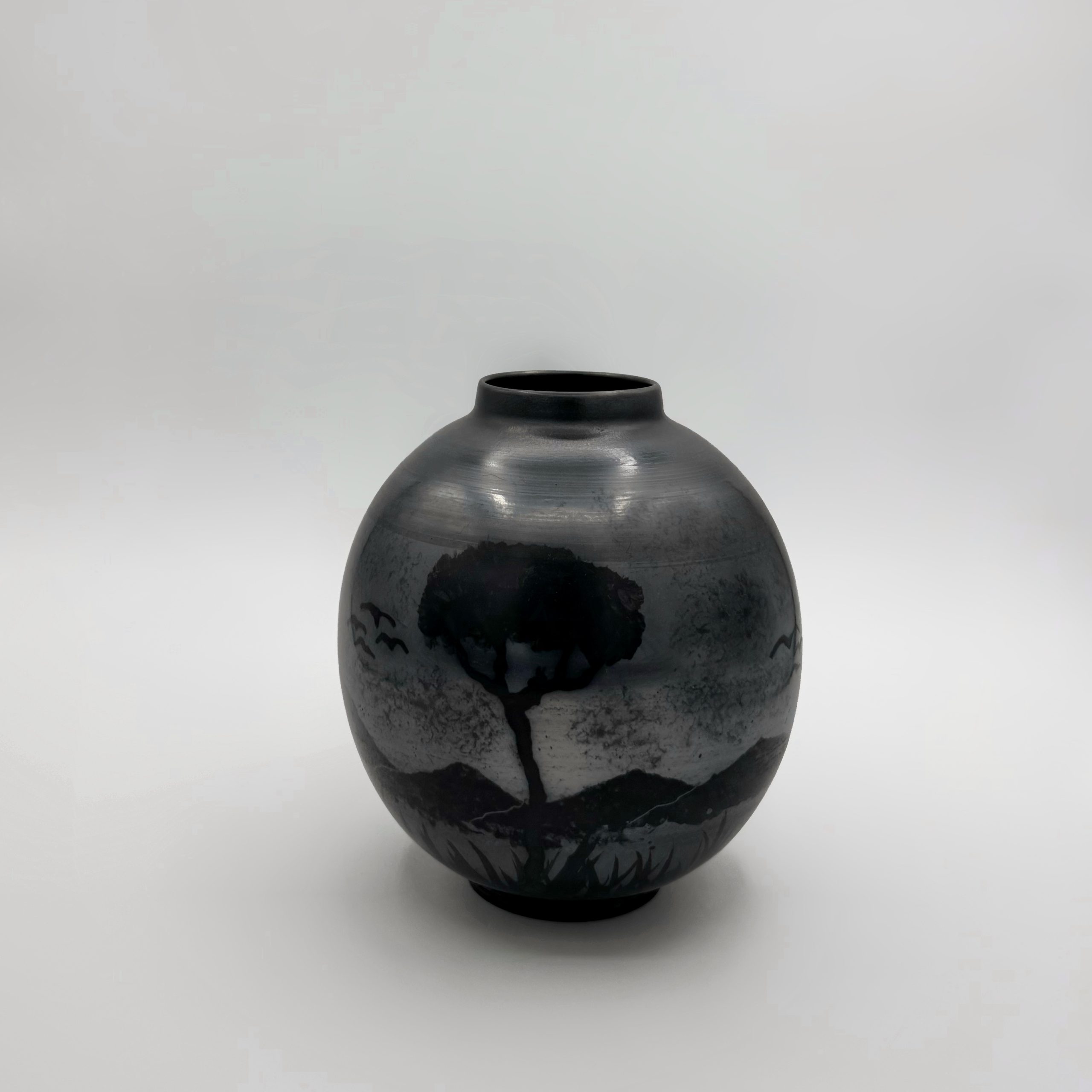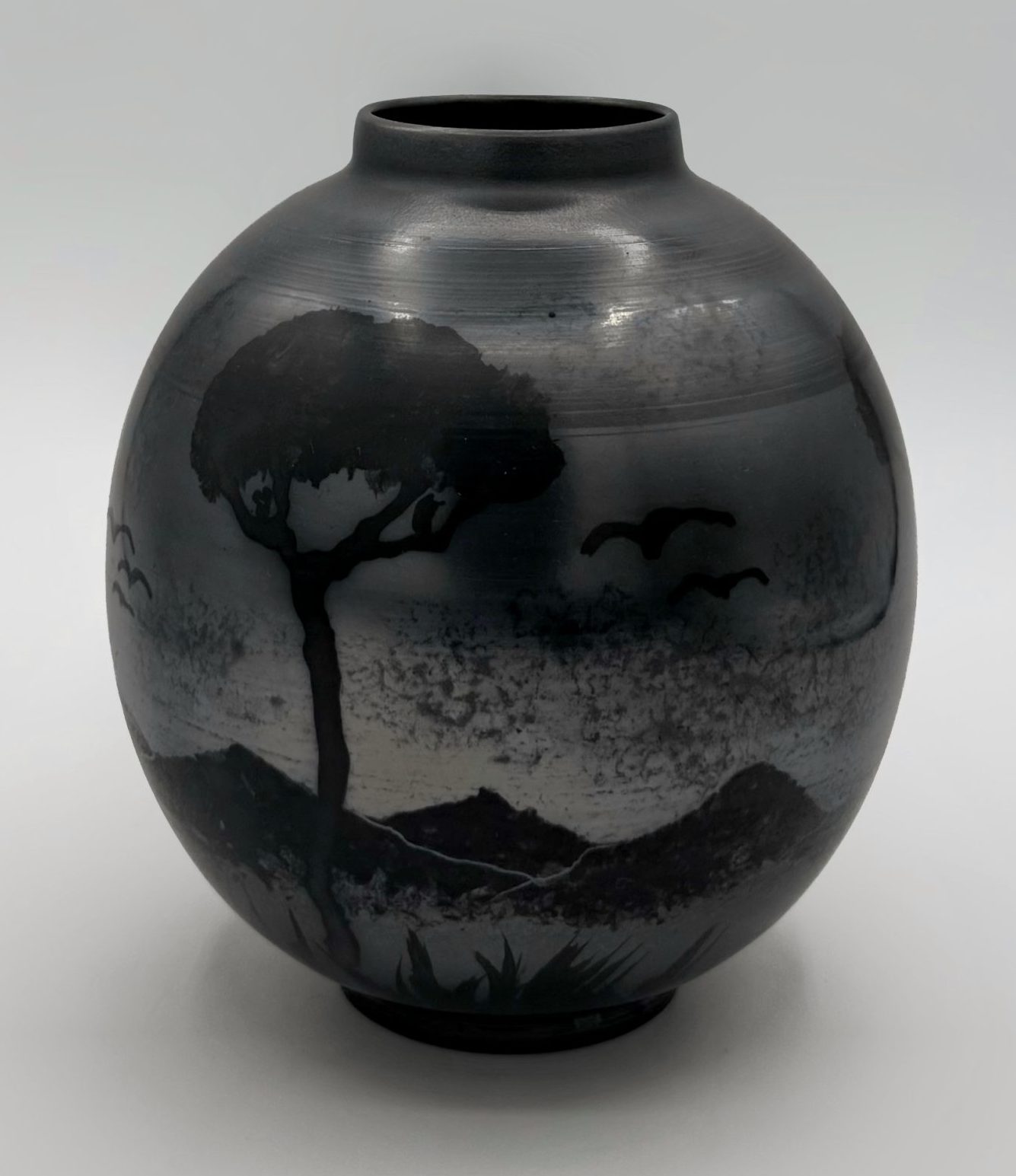 Barro rojo, torneado,bruñido y decorado con reservas. Cocido en reducción.