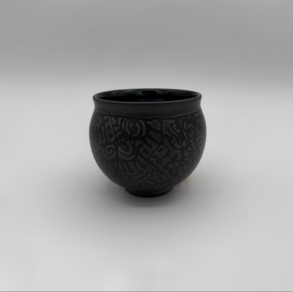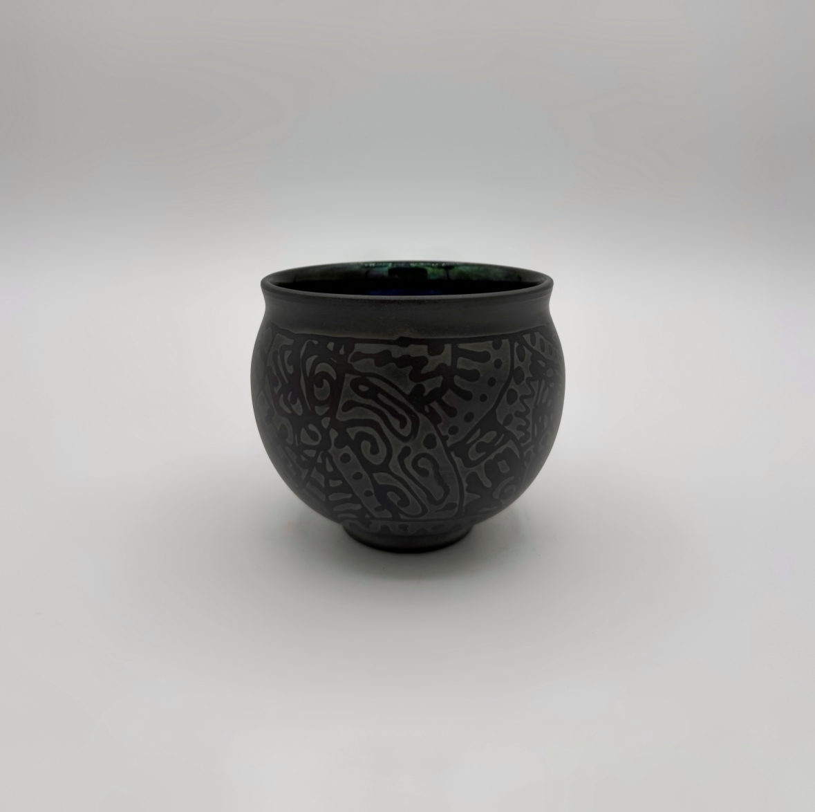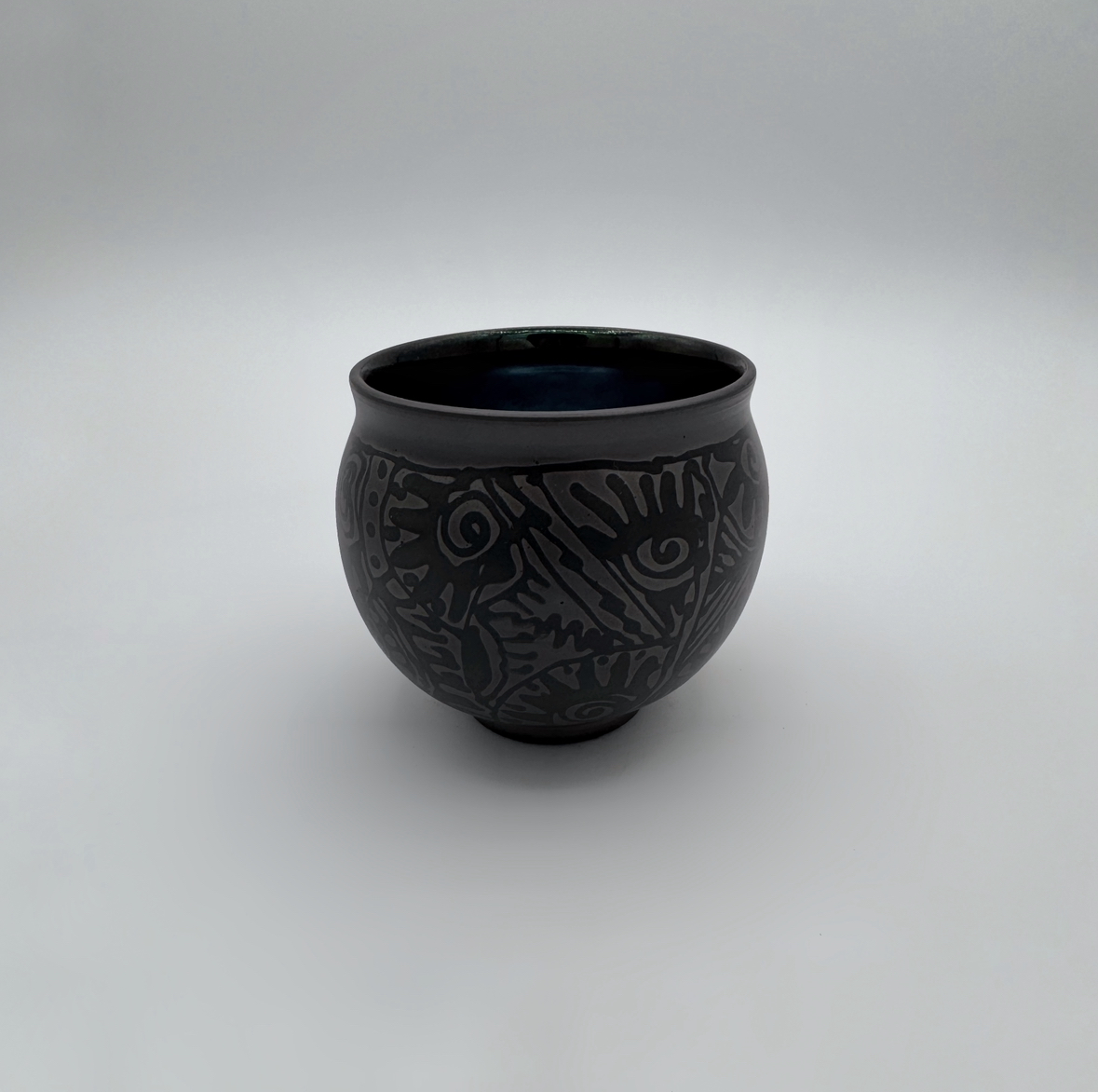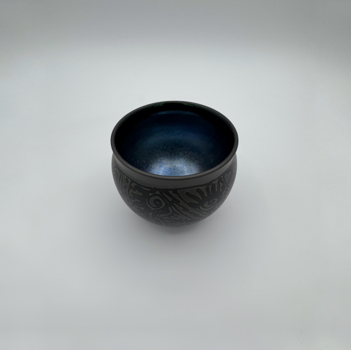 Barro rojo, torneado,bruñido,esmaltado en el interior con reflejo metálico y decorado con reservas. Cocido en reducción. Decoración etnica.