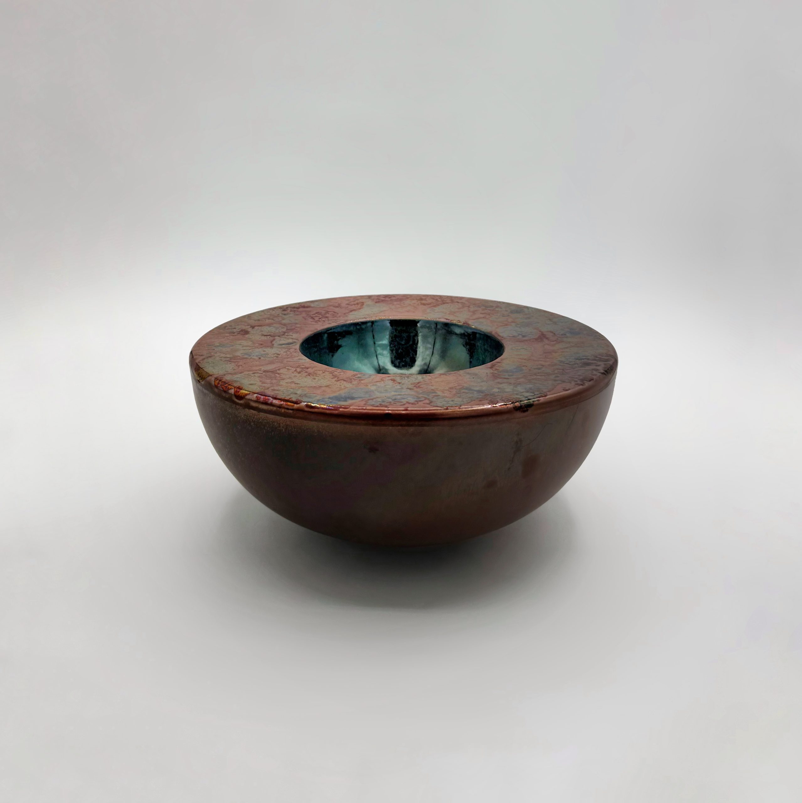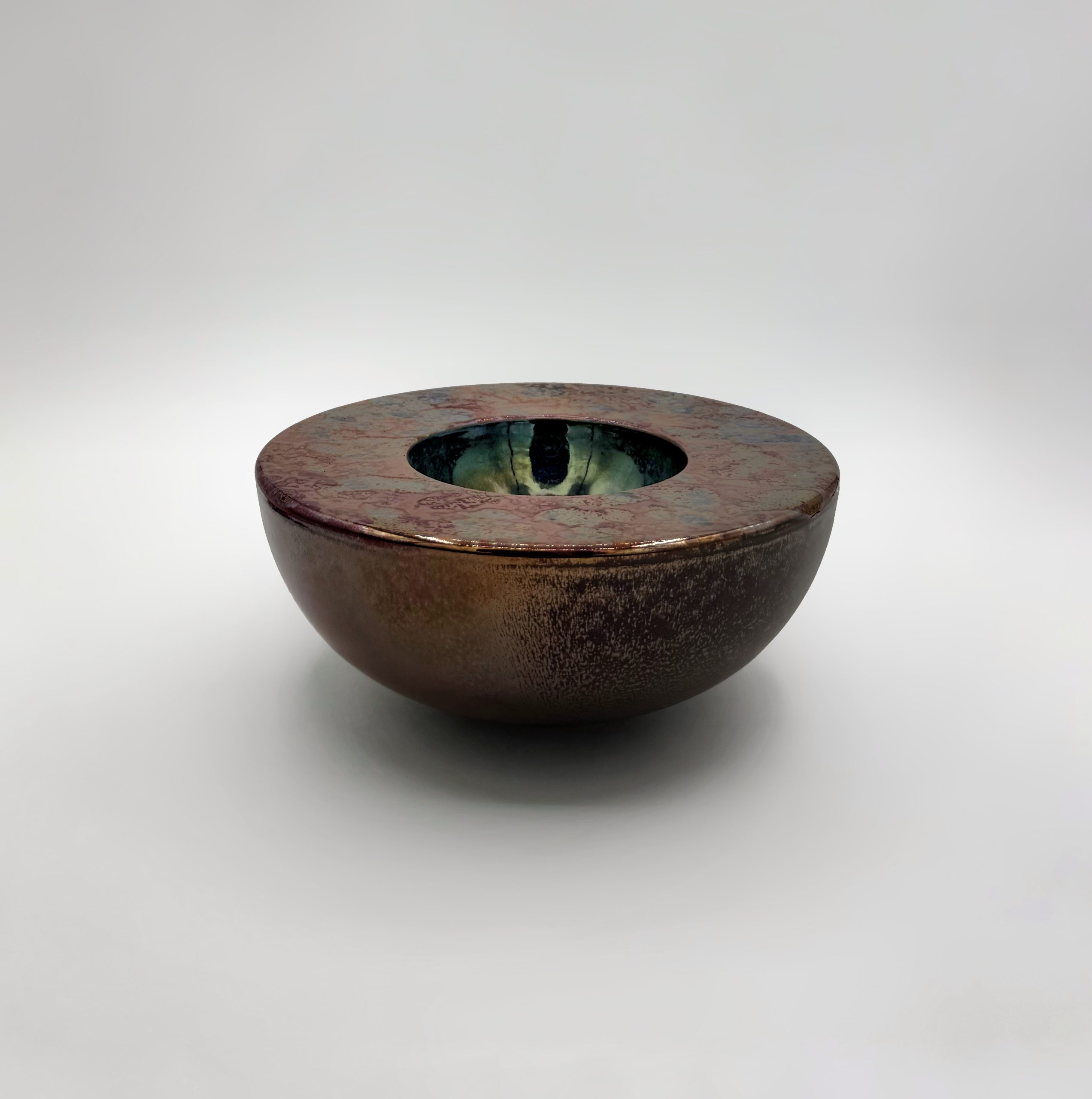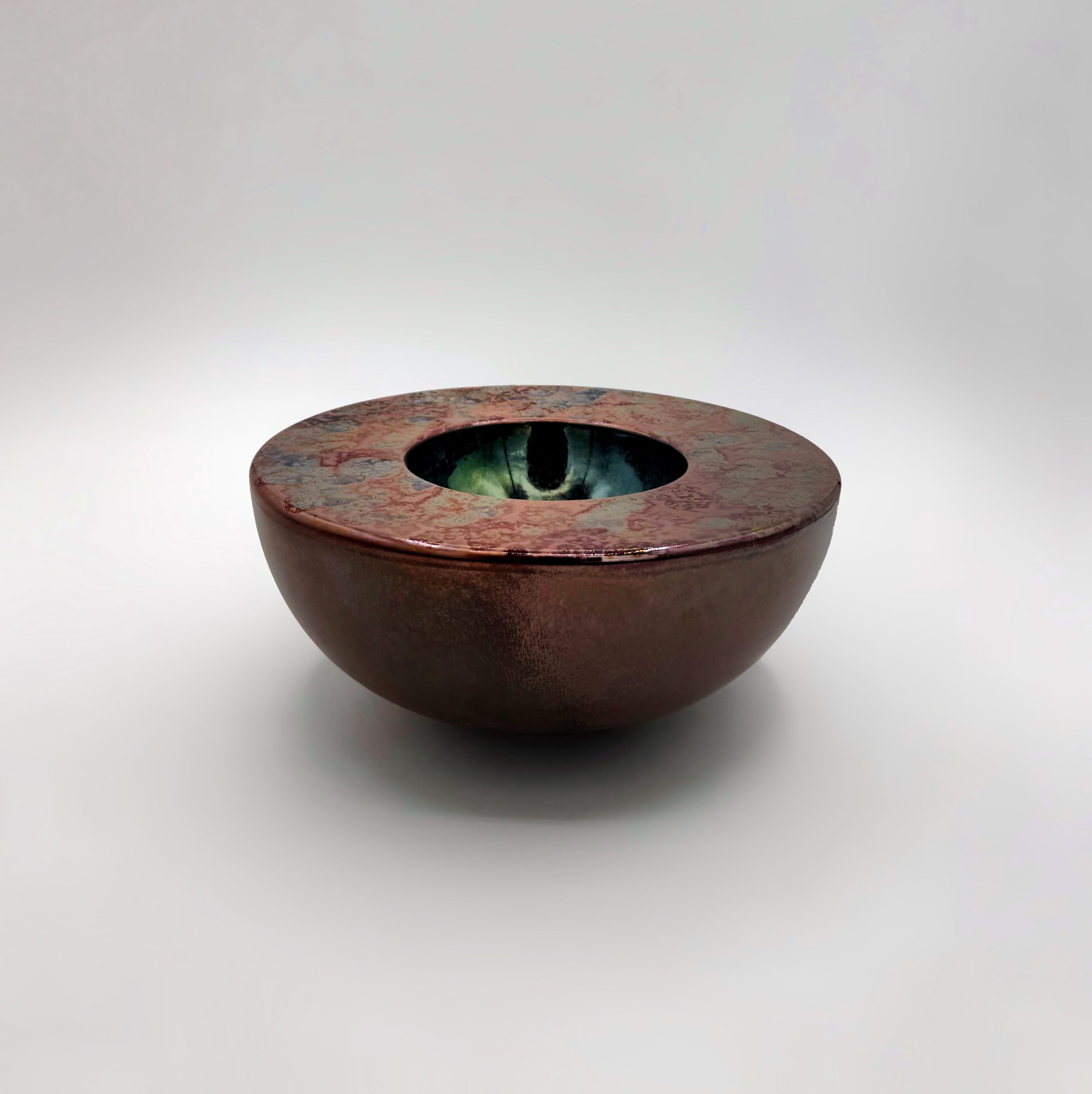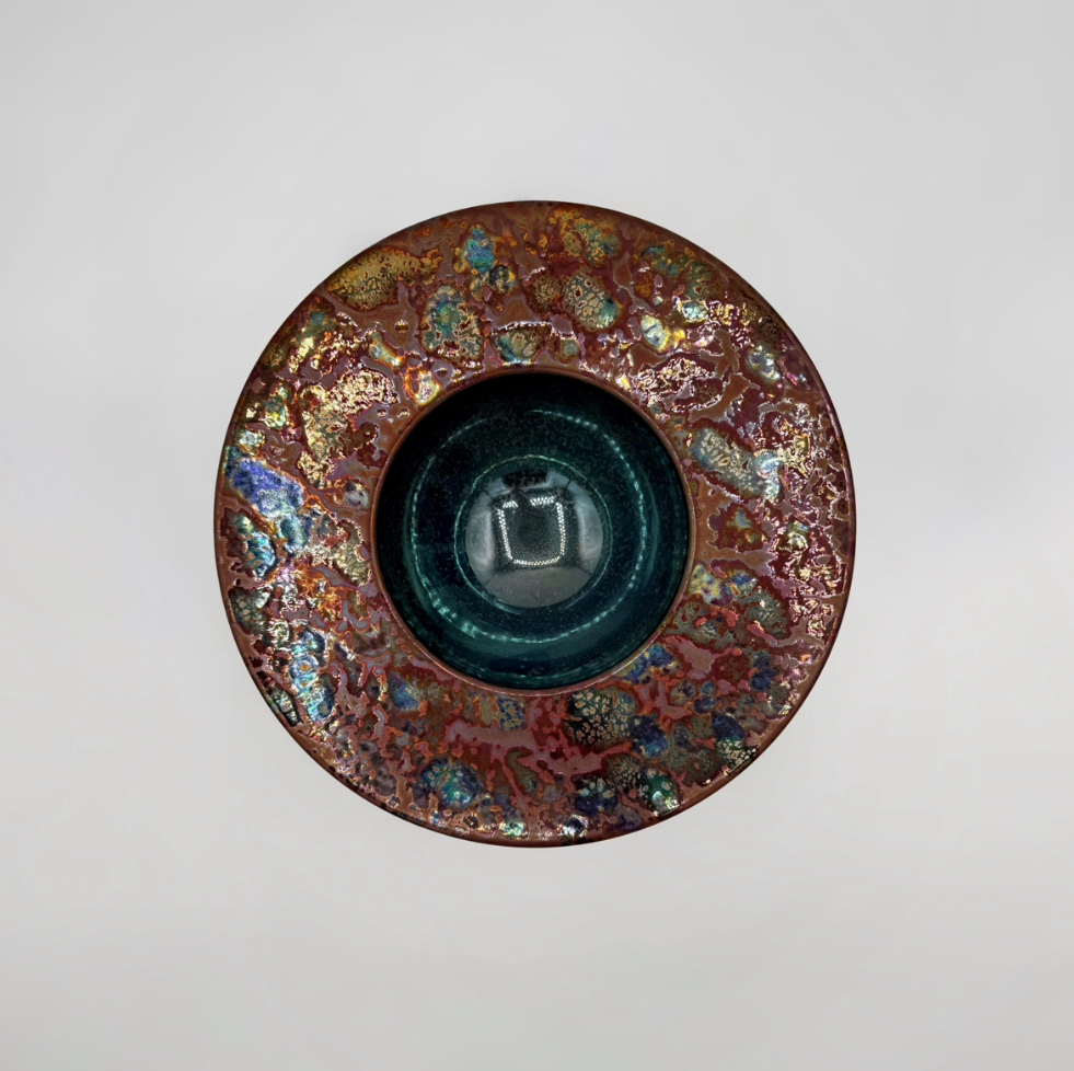 Barro rojo, hecho al torno con esmaltes de Reflejos Metálicos, cocido a 1035°C en reducción.