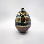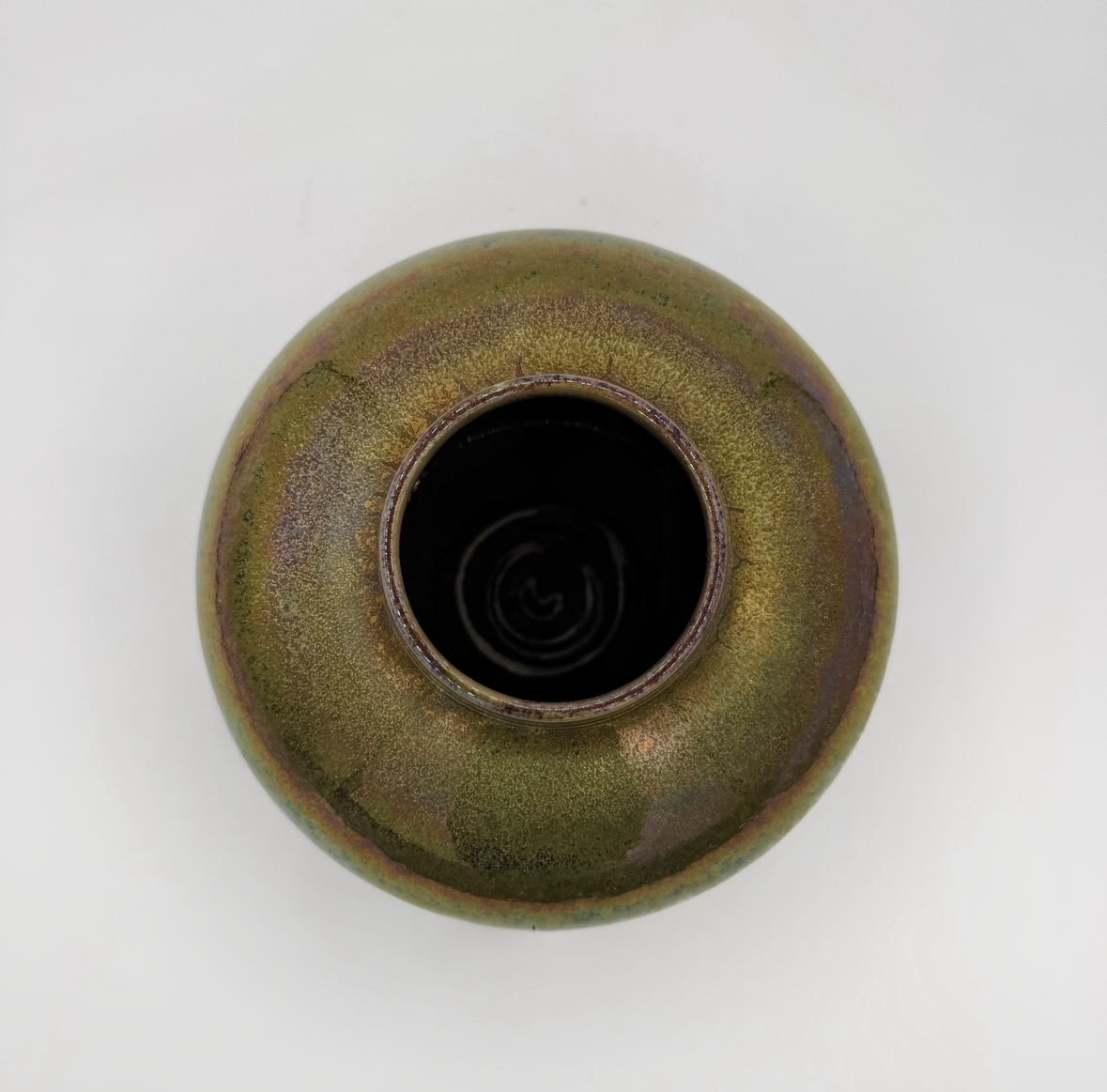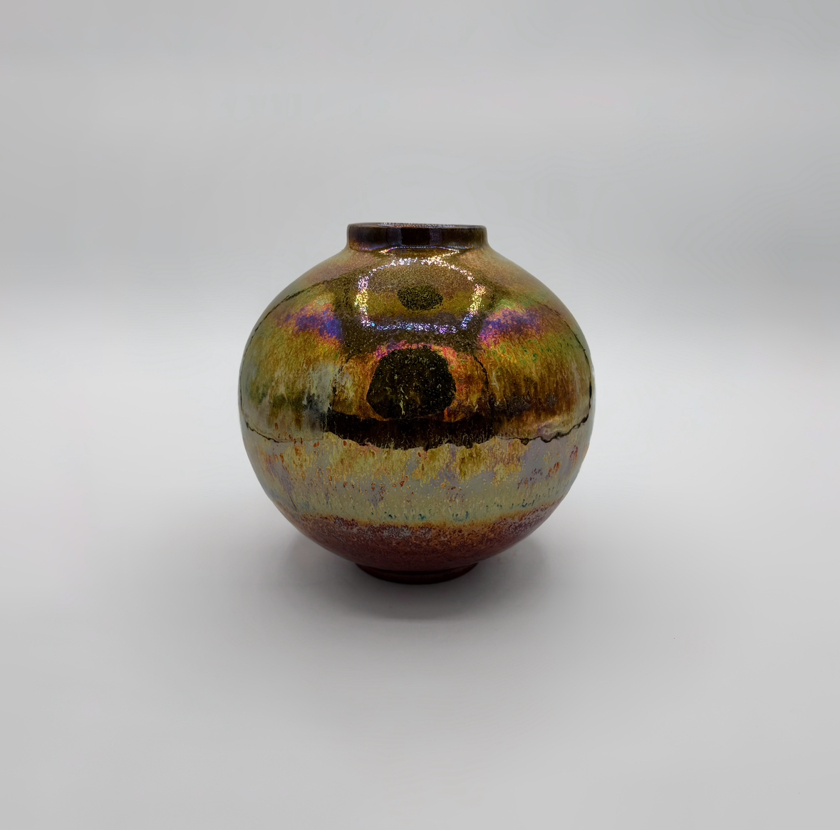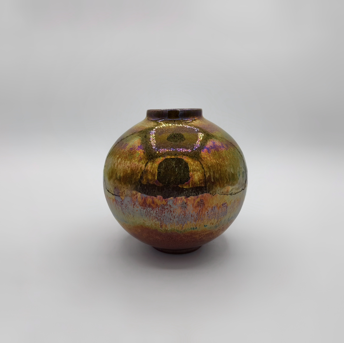 Barro rojo, hecho al torno con esmaltes de Reflejos Metálicos, cocido a 1035°C en reducción.