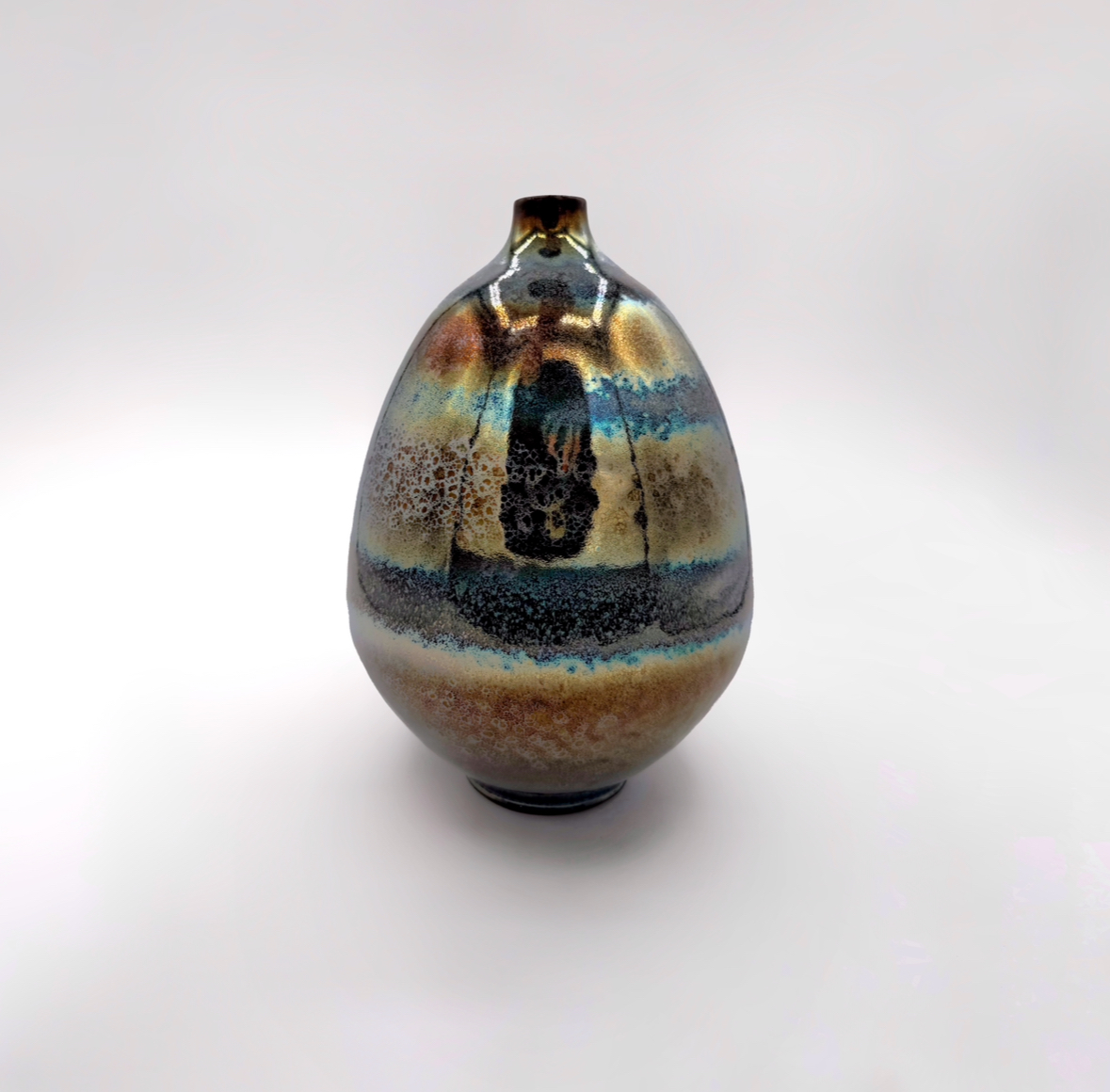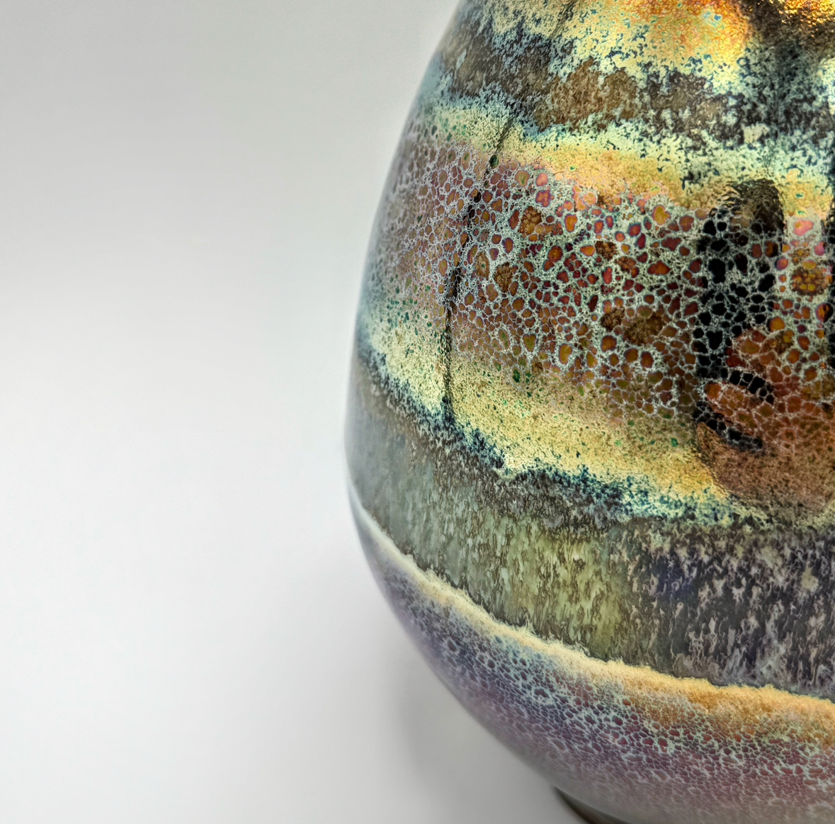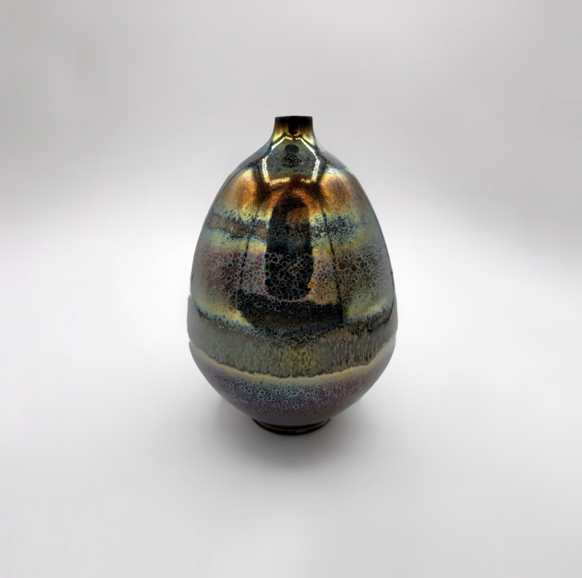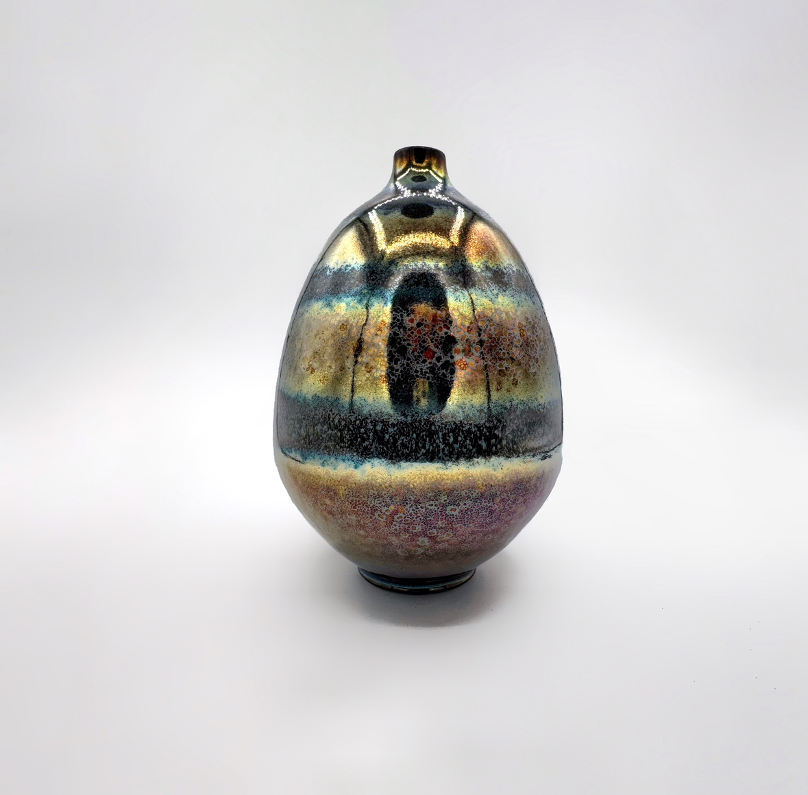 Barro rojo, hecho al torno con esmaltes de Reflejos Metálicos, cocido a 1035°C en reducción.
